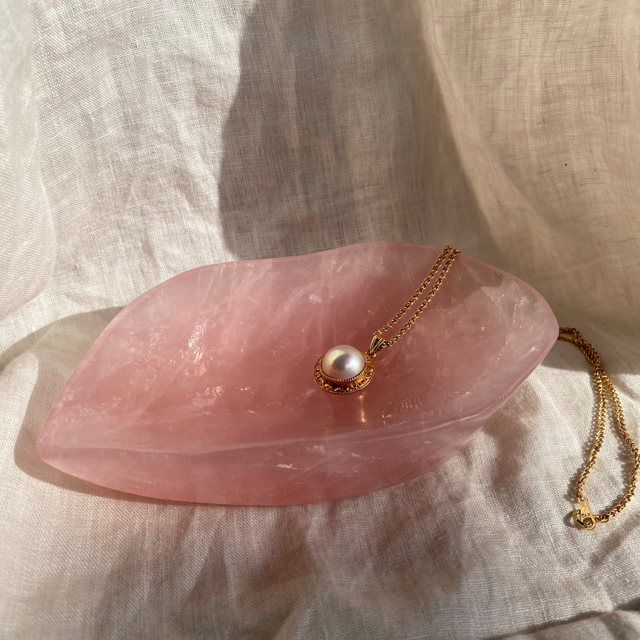 ピンク色が濃いめのディープローズクオーツを贅沢にあしらったローズクオーツのトレイです!