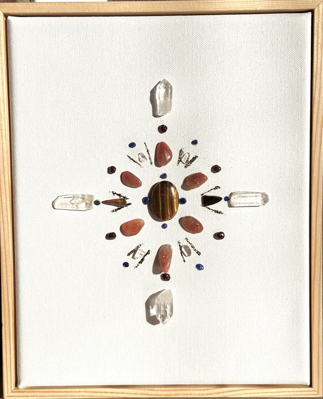 このアートは、自然が紡いできた物語をそのまま閉じ込めた一枚です。 上下に配置されたのは、千葉・勝浦の海で出会った貝殻。 潮の流れや太陽の光に長い時間をかけて磨かれたその姿は、 まるで 海と風が描いたアートピース のよう。 手にした瞬間から、どこか懐かしい優しさと、自然そのものの静かな息づかいが伝わってきます。 中央に佇む ピクチャージャスパー は、大地の風景をそのまま切り取ったかのような天然石。 砂漠の地平線、遠くの山並み、朝焼けの色… 見る人それぞれに違う“内なる景色”を映し出す、瞑想的な石でもあります。 そのそばに添えた ガーネット は、生命力と芯の強さを象徴する石。 自然のアートの中に深紅のアクセントが加わることで、 全体に温かな力強さが静かに宿ります。 散りばめられたクリアクォーツは、 光を集め、アート全体のエネルギーを優しく整える存在。 晴れた日差しの下では、小さな光がキャンバスに映り込み、 まるで海辺のきらめきを再現するかのようです。 ⸻ このアートが届けるもの • 海と大地に守られるような安心感 • 自然のリズムと一致する穏やかさ • 日常の中でふと深呼吸できるようなス ✴︎仕様 • サイズ:273×220mm • 使用石:ブラジル産水晶、ピクチャージャスパー、ガーネット、シェル • キャンバス素材(木枠付き) • 一点もの(再販なし) ⸻ ✴︎おすすめの飾り場所 瞑想スペース、リビング、玄関、お部屋の一角… どこに置いてもその場所にそっと“呼吸”が生まれ、 空間と心の両方を優しく整えてくれます。 海、地球の風景、そして天然石の波動がひとつの作品になった特別なアート。 日々を心地よく過ごすための、美しいお守りとなりますように。 【WHAT IS CRYSTAL GRID?】 https://sharmoniser.theshop.jp/blog/2023/01/30/173125 クリスタルグリッドとは 自然のエネルギーと美をひとつにした、ヒーリングアート。 ひとつひとつの石が持つ波動を、神聖な幾何学のパターンで配置することで、 空間に“調和”と“意図のエネルギー”を生み出します。 グリッドはただの飾りではなく、あなたの願いや心の在り方を映すパワースポット。 眺めるたびに心が静まり、エネルギーが整っていくのを感じられるはずです。 制作前には、クリスタルと空間の浄化、瞑想、オラクルカードによるインスピレーションを通して、 クリスタルヒーラーである店主が一つ一つ丁寧に配置しています。 あなたの内側に光を灯す、世界にひとつだけのグリッド。 それぞれのクリスタルの意味と、このグリッドのメッセージカードを添えてお届けします。 硬度が低く割れやすいですのでお取り扱いにご注意ください。 ▼出品商品の全ては天然の物ですのでクリスタルの形がまばらであったり不純物や内包物、色むら、天然キズ、ひびがある場合がございます。全て自然の美しさとしてぜひお手に取って楽しんでください。 ▼日中の自然光で撮影しております。光の入り方、陽の色などの撮影環境によって実物と見え方が多少異なる場合がございます。 ▼環境に配慮し最低限の簡易包装で大切に商品をお届けいたします。 ▼アルモニゼではセッションとクリスタルの売り上げの一部を人権と環境を保護する団体に寄付させていただいております。 ▼ご注文確認後3〜5日以内に発送いたします。