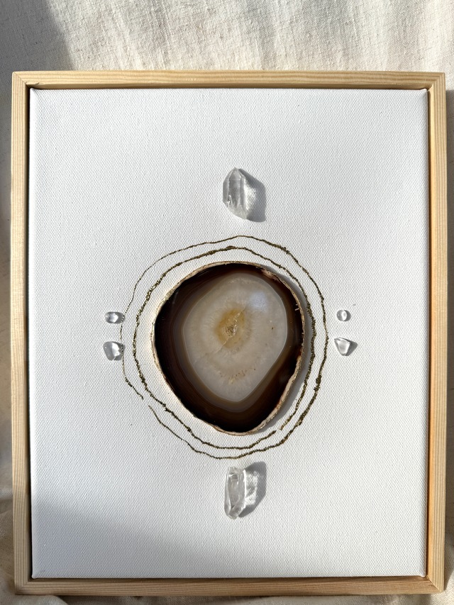センターには、ドゥルージーを内包したブラジル産アゲートを配置。 ミッドセンチュリーを思わせる深みのあるブラウンカラーが、空間に静かな品格と温もりをもたらします。 アゲートの縁には金箔をあしらい、 自然の中に宿る神聖さと、目に見えないエネルギーの流れを象徴的に表現しました。 上下には、ゼッカ・デ・ソウザ産の水晶。 澄んだクリアな波動が、このアート全体のエネルギーを整え、 空間に穏やかな循環と守護のリズムをもたらします。 オーガニックなフォルムと、光を受けて変化する表情は、 自然界に存在する“ゆらぎ”や“呼吸”そのもの。 時間や角度によって異なる表情を見せ、 眺めるたびに心を静かに現在へと戻してくれる存在です。 インテリアとしての美しさはもちろん、 空間を整え、意識の中心に立ち戻るためのアートピースとして。 ご自身のために、また大切な方への贈り物にもおすすめです。 ⸻ ⭐︎メッセージカード付き グリッドに使用されたクリスタルの意味と、 「Guardian of Sacred Flow」からのリーディングメッセージを添えてお届けします。 このグリッドは、 あなたの中に流れる神聖なリズムを思い出し、 人生の流れに身を委ねながら、自分らしい道を歩む勇気を呼び覚ますアートピースです。 【おすすめのディスプレイ場所】 オフィス、サロン、スタジオ、リビング、玄関、など常に意識や目を向けてあげることができる場所へ置いてください。 グリッドからエネルギーが放出され空間を良いエネルギーで充満させていきます。 強い直射日光を長時間当ててしまうとクリスタルの色が退化しています恐れがあります。 このグリッドを使用したメディテーション方法もオススメです。 (クリスタルに視点、意識を集中させたり、このグリッドへの想いをマントラにしたメディテーションなど) クリスタルグリッドを通じて、日々の生活でより豊かな気持ちを持ち、充実した人生を送るお手伝いをしたいと願っています。 【SIZE】 21cm×29.7cm 【CARE】 立て掛け、壁掛け(紐をおつけします)ができます。 月光浴・セージ・音叉等での浄化が可能です。 硬度が低く割れやすいですのでお取り扱いにご注意ください。 ▼出品商品の全ては天然の物ですのでクリスタルの形がまばらであったり不純物や内包物、色むら、天然キズ、ひびがある場合がございます。全て自然の美しさとしてぜひお手に取って楽しんでください。 ▼日中の自然光で撮影しております。光の入り方、陽の色などの撮影環境によって実物と見え方が多少異なる場合がございます。 ▼環境に配慮し最低限の簡易包装で大切に商品をお届けいたします。 ▼アルモニゼではセッションとクリスタルの売り上げの一部を人権と環境を保護する団体に寄付させていただいております。 ▼ご注文確認後3〜5日以内に発送いたします。