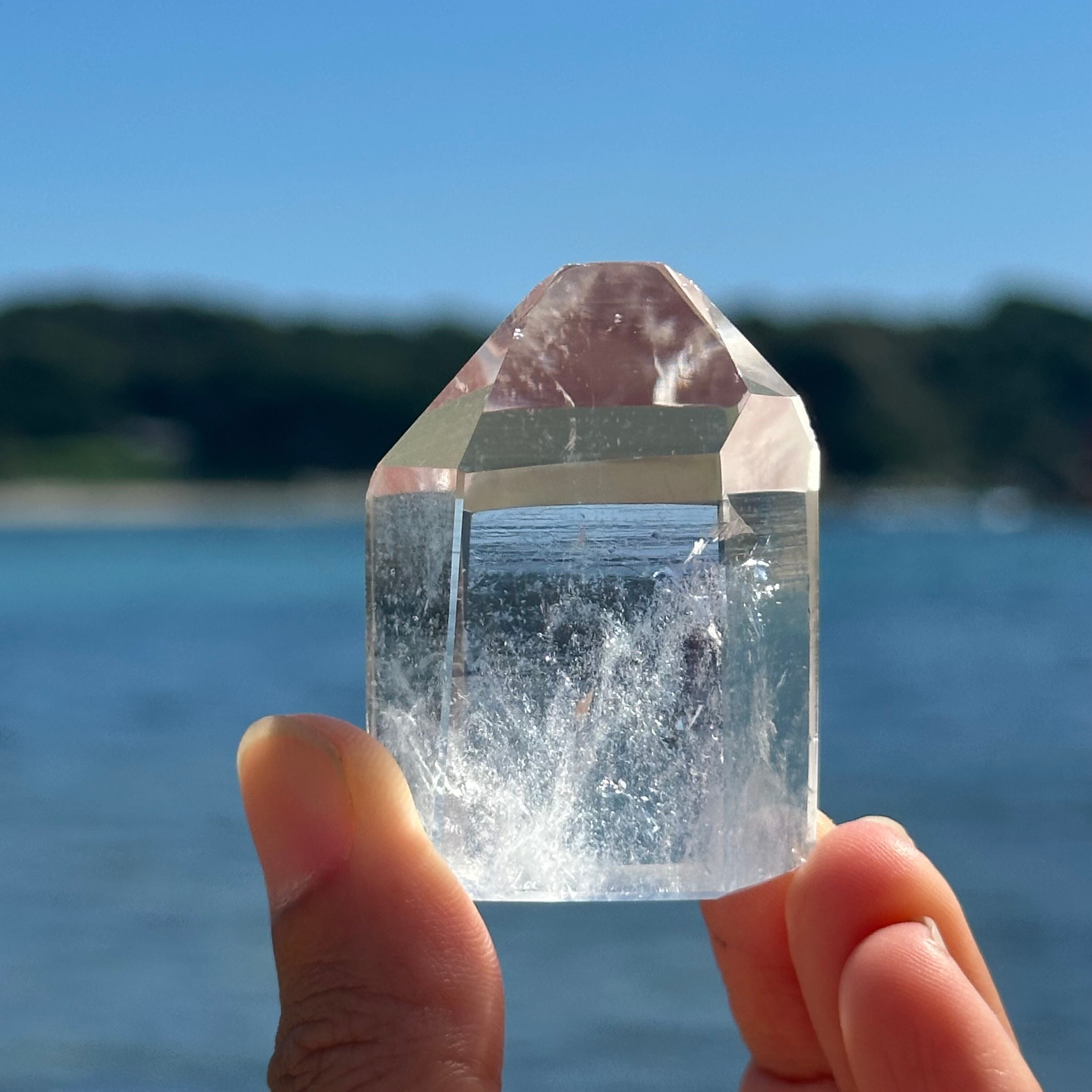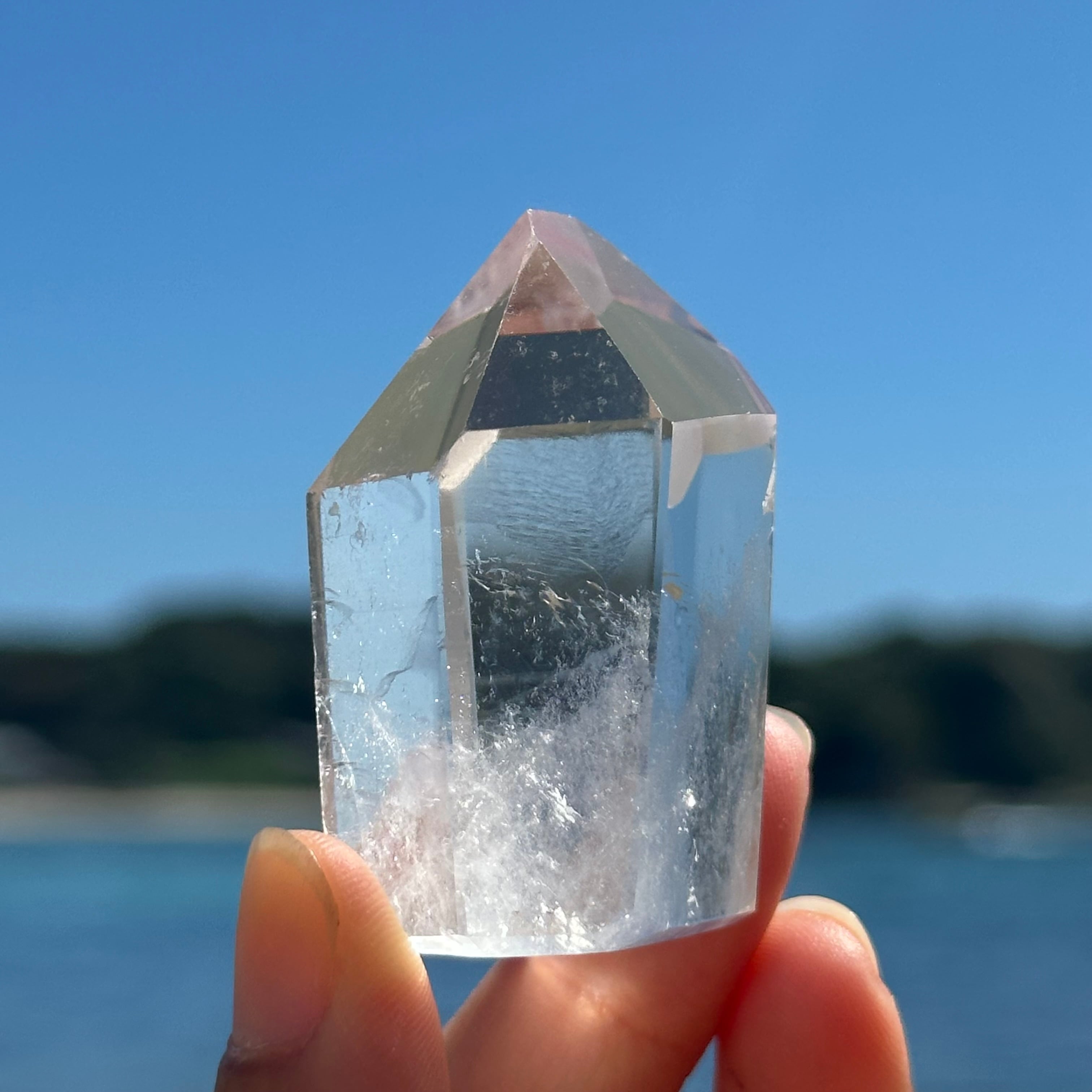 透明感と奥行きを兼ね備えた、手のひらサイズの天然水晶ポイントです。