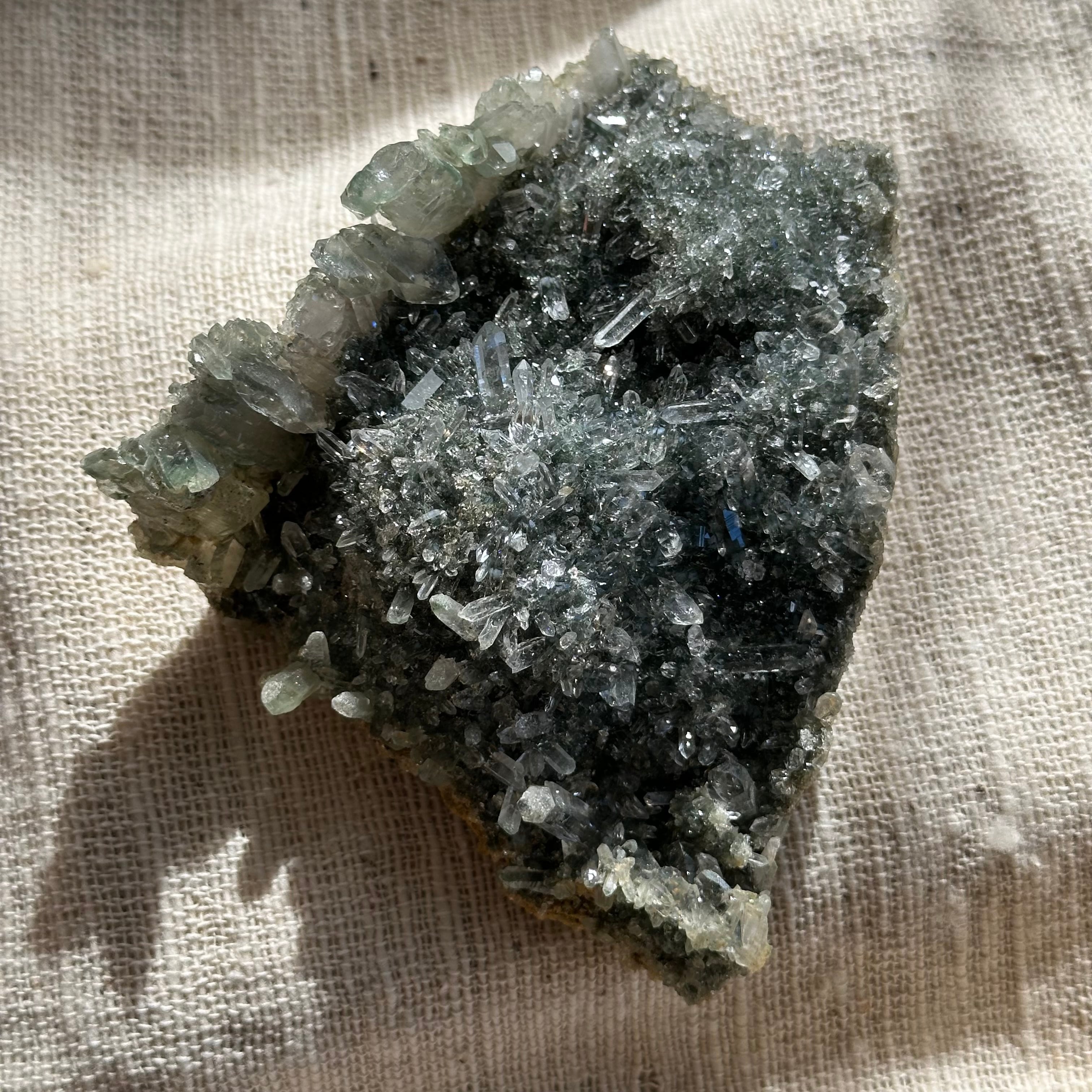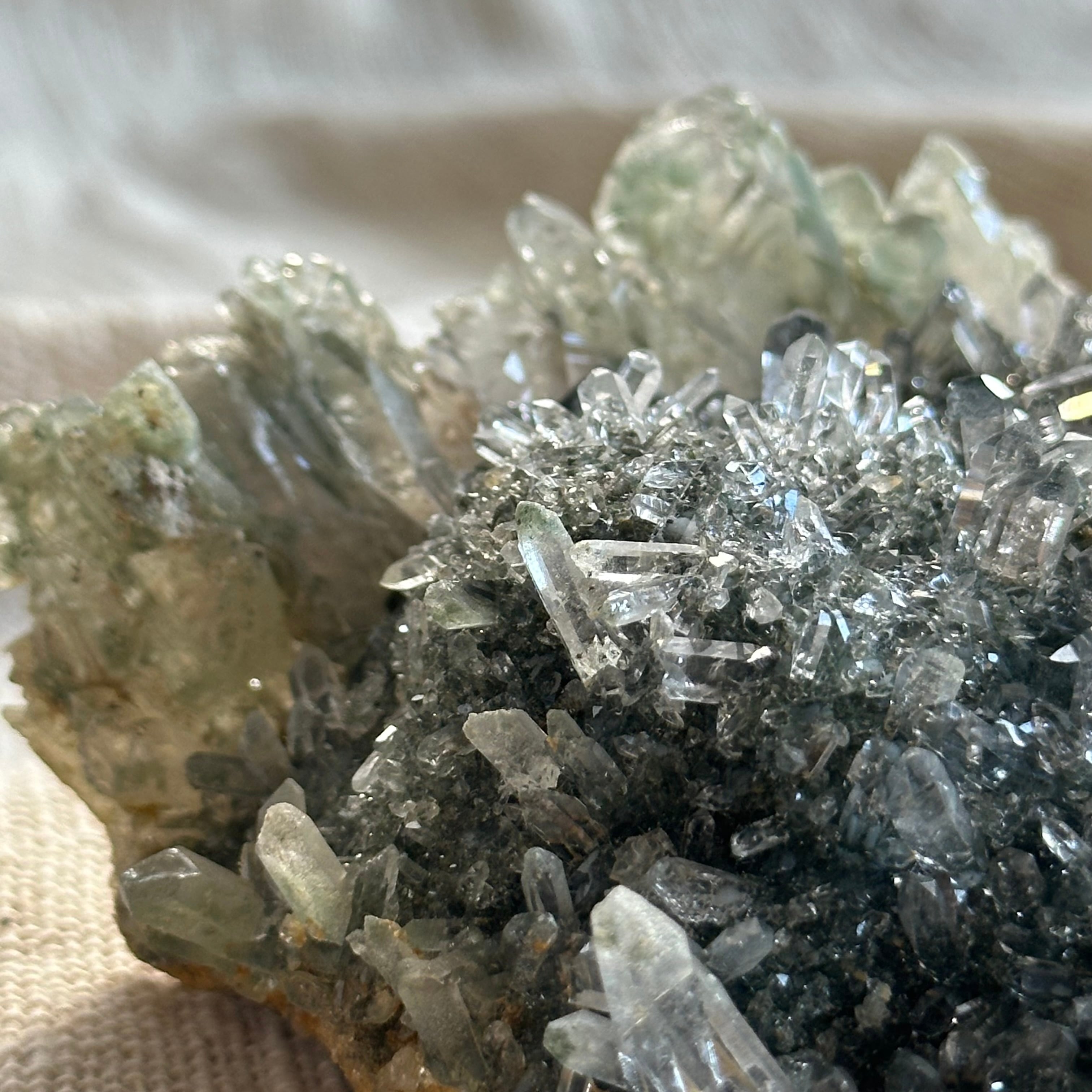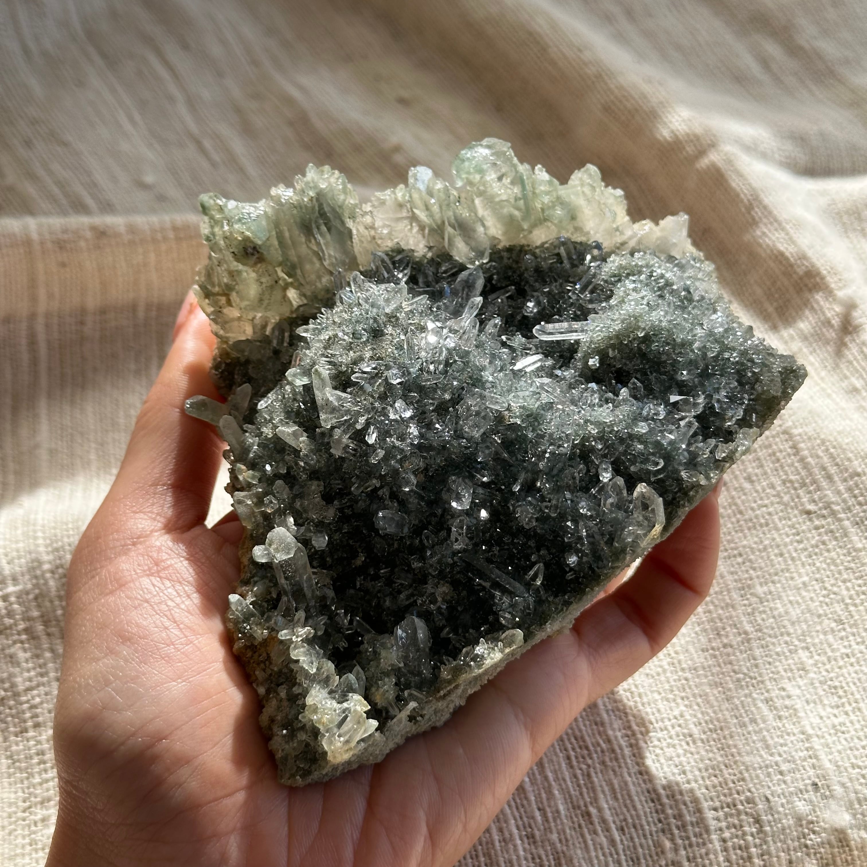 透明度、ポイントの美しさ、クローライトの柔らかな色味。