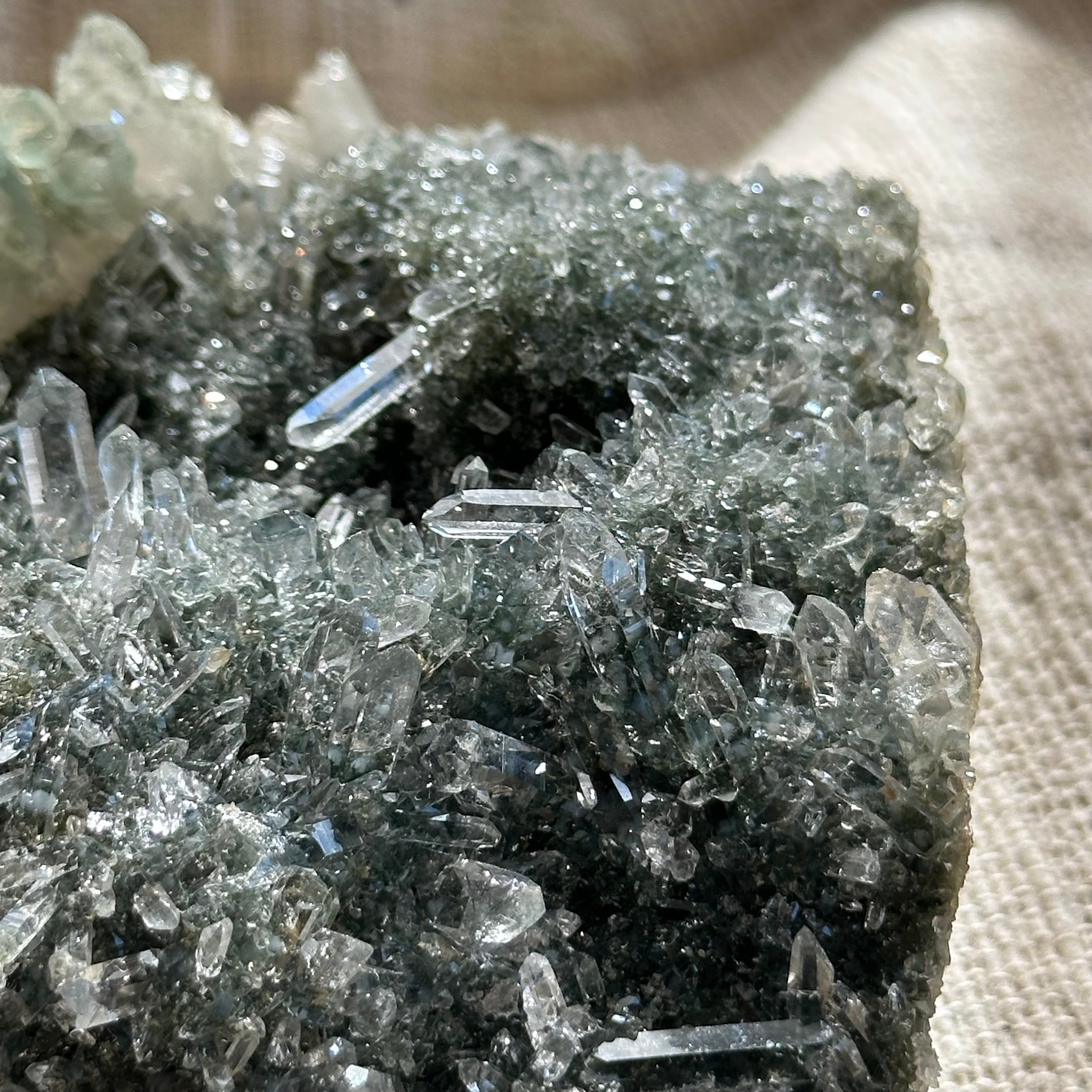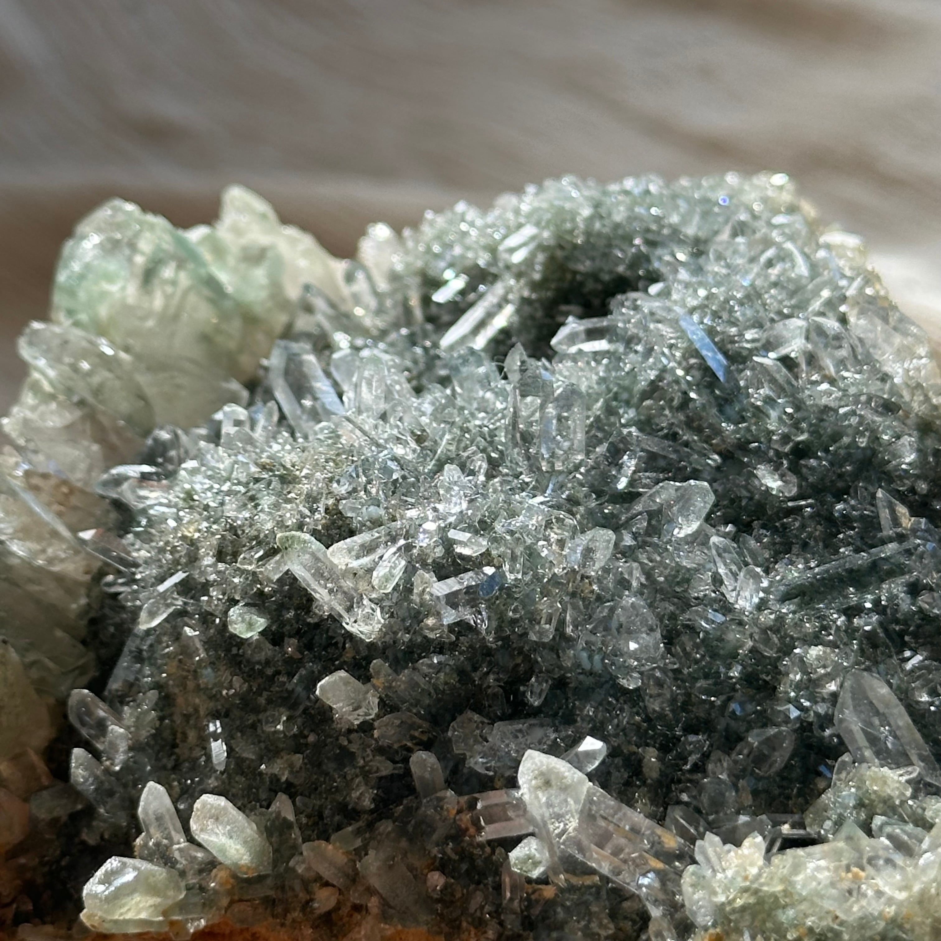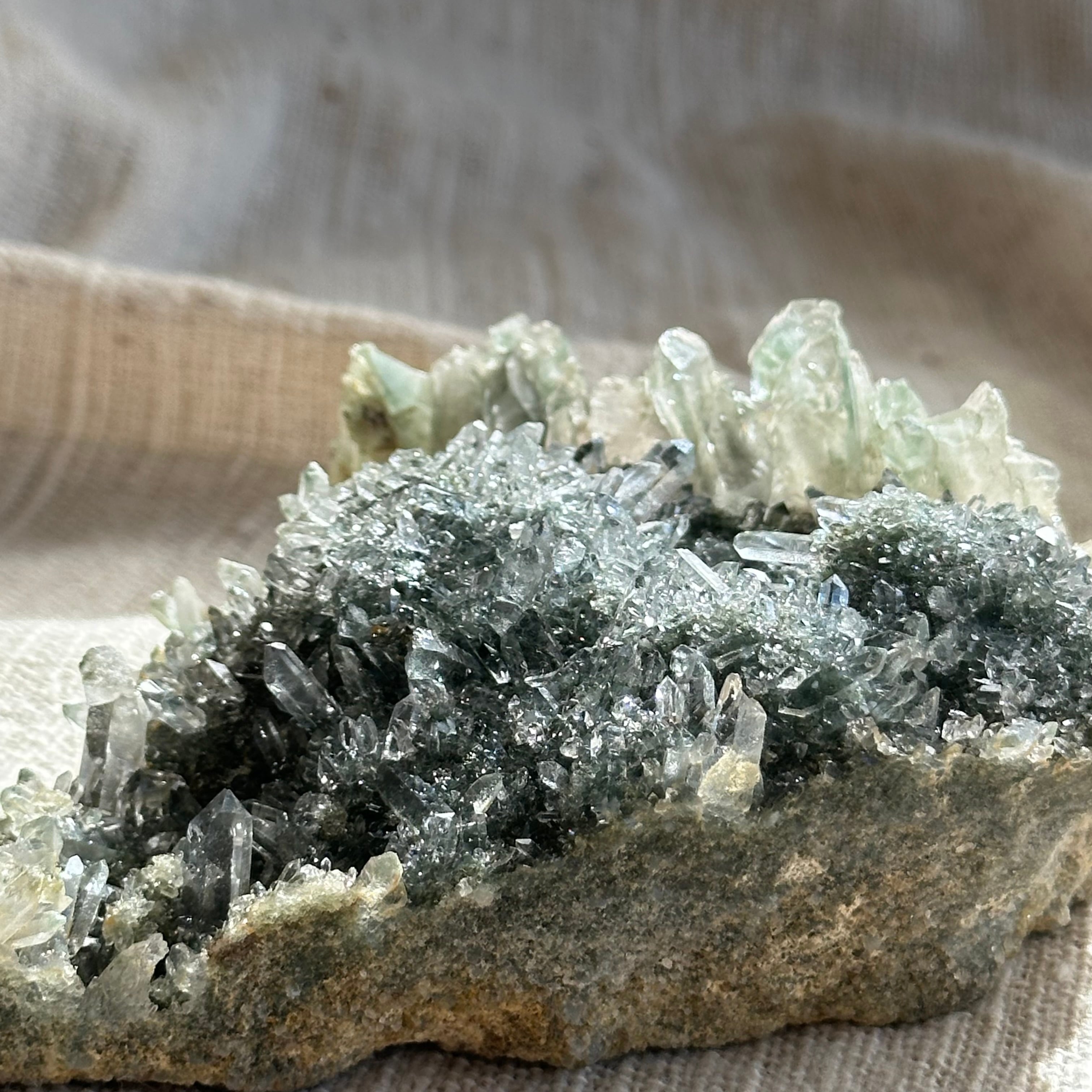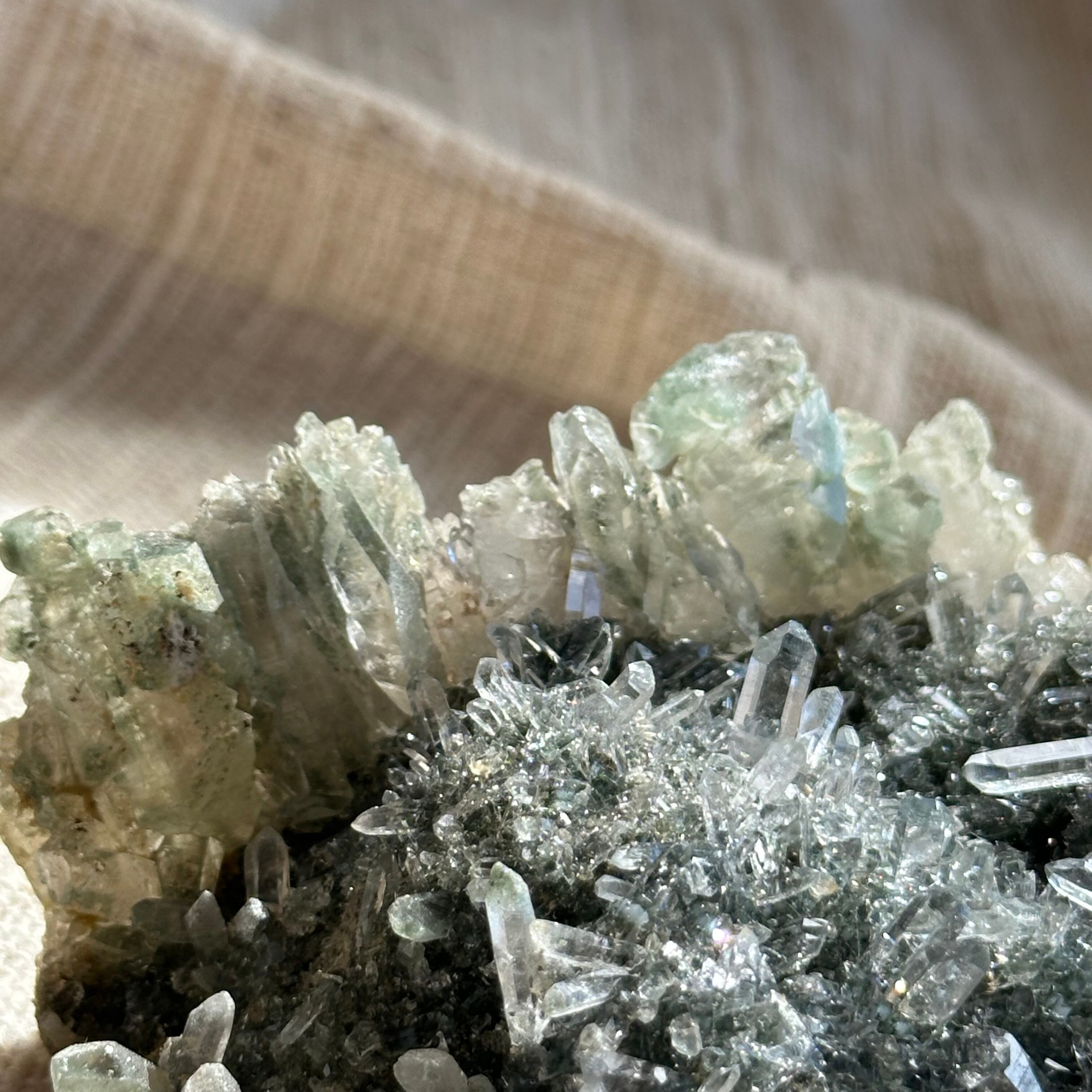 透明度、ポイントの美しさ、クローライトの柔らかな色味。