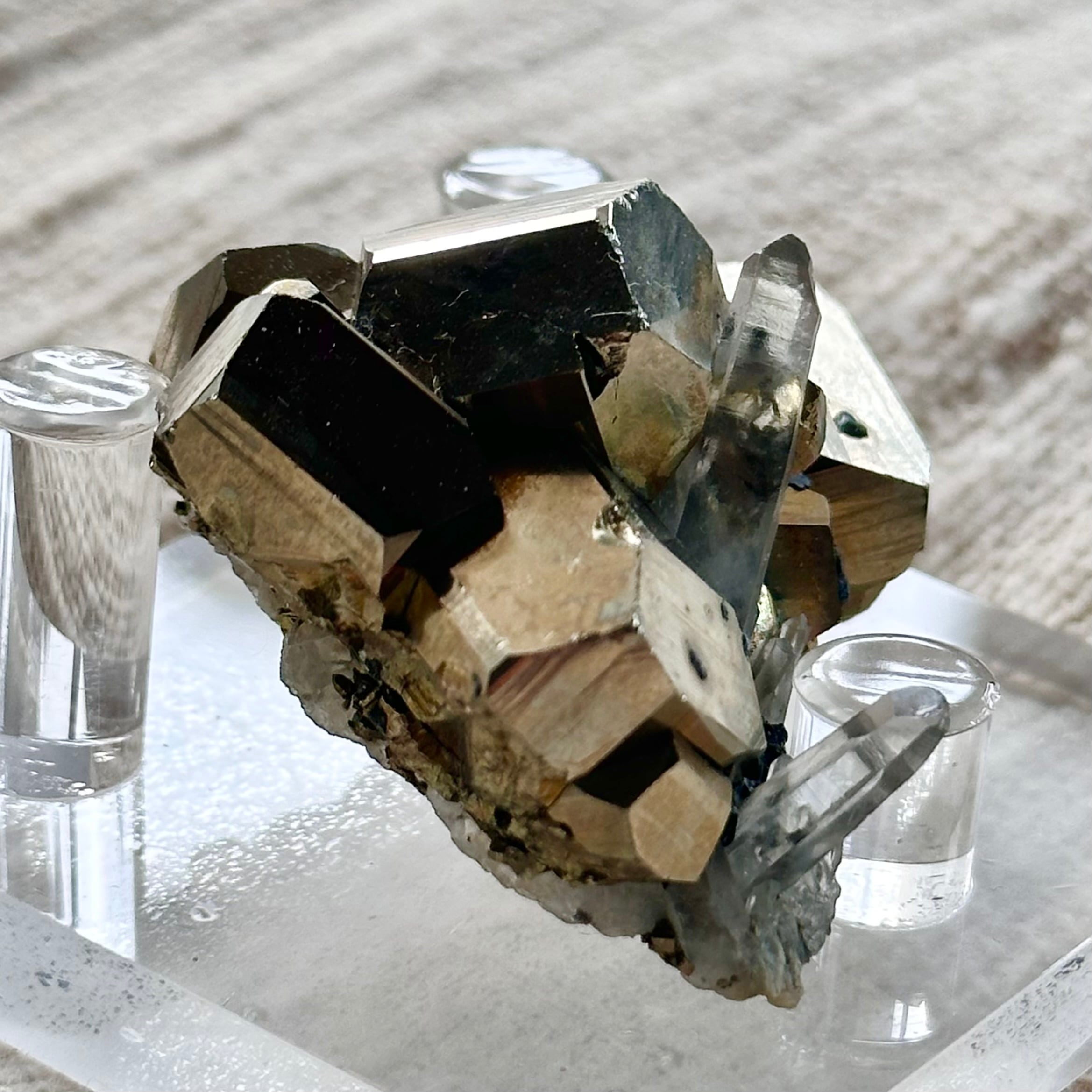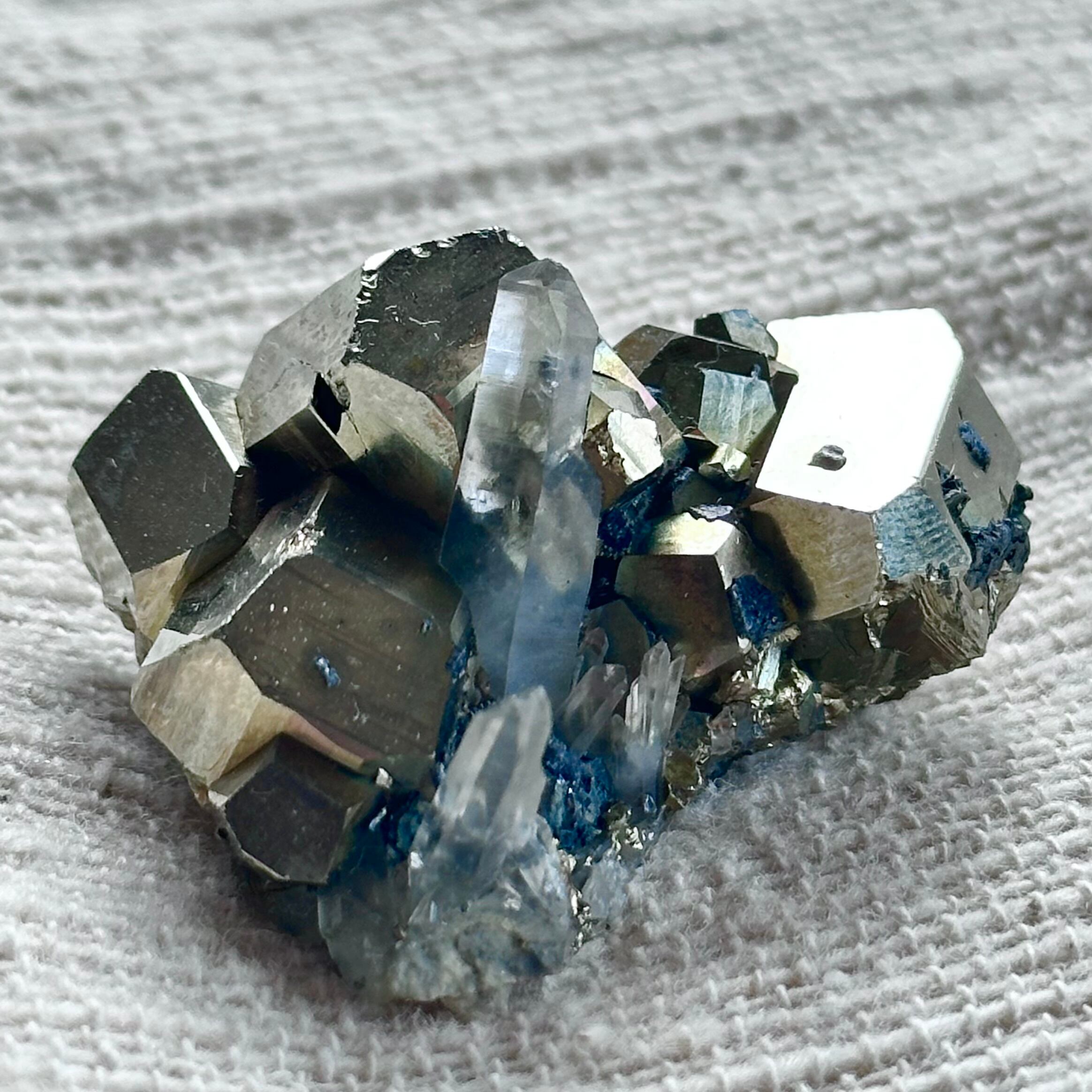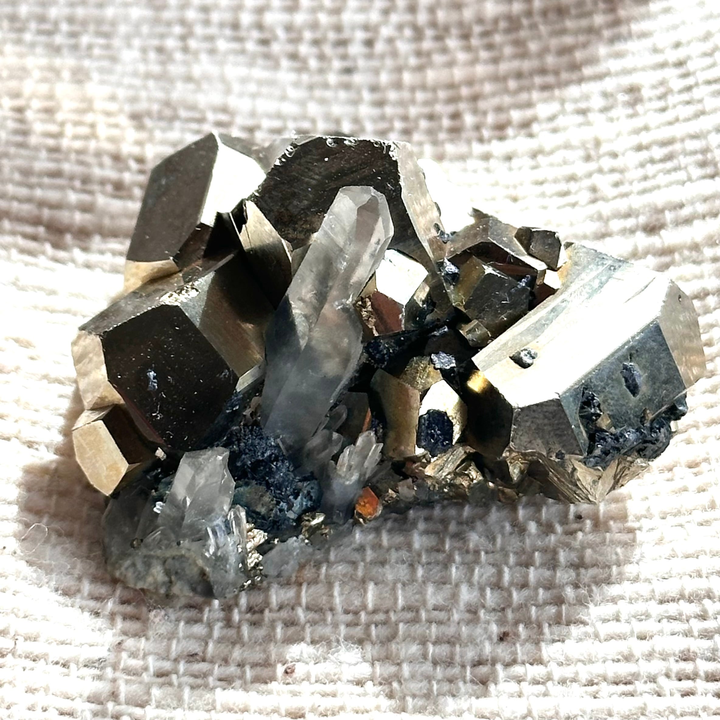 力強さを感じさせるパイライトの結晶と、澄んだ石英ポイントの組み合わせは、重さと軽やかさ、地と光のバランスを思わせる佇まい。