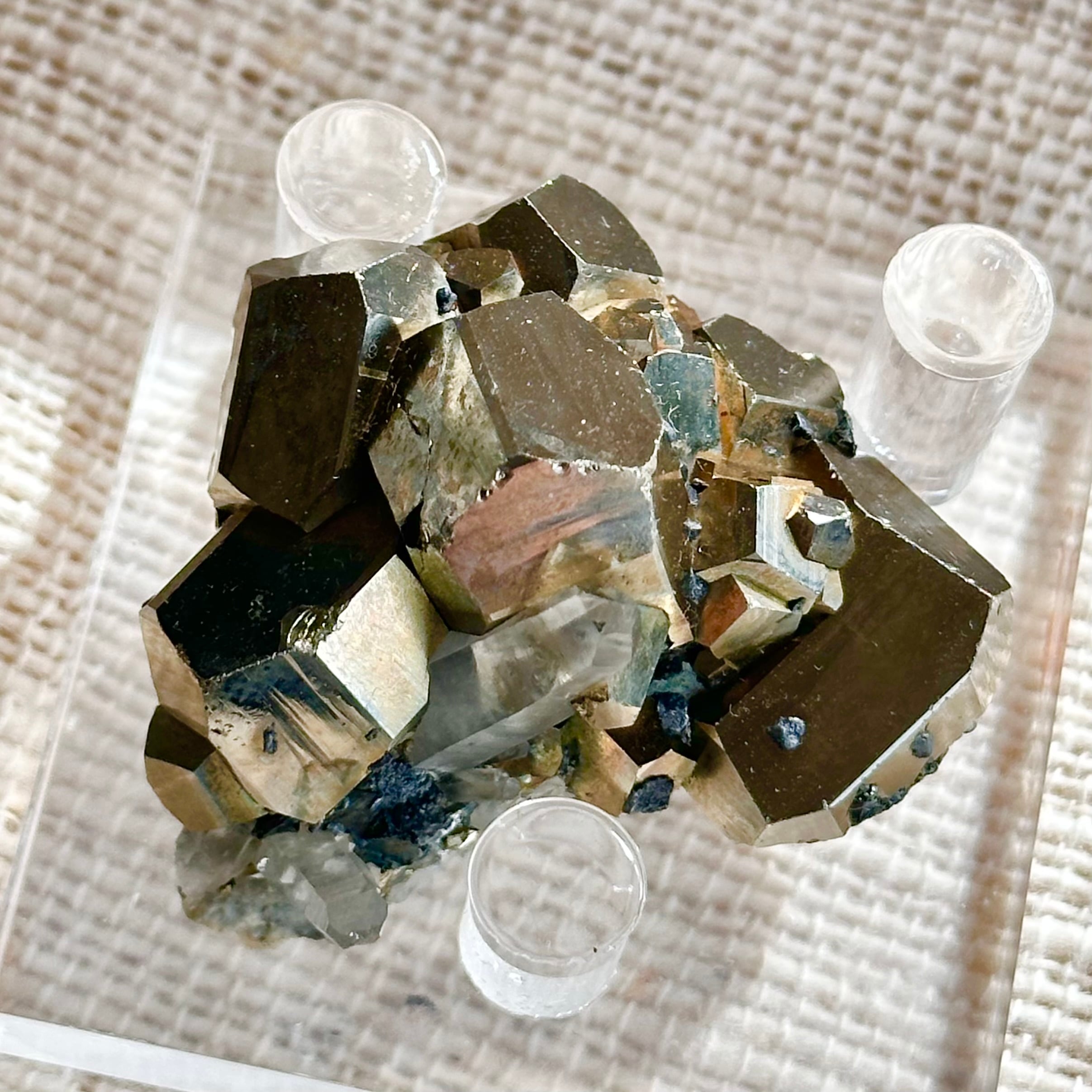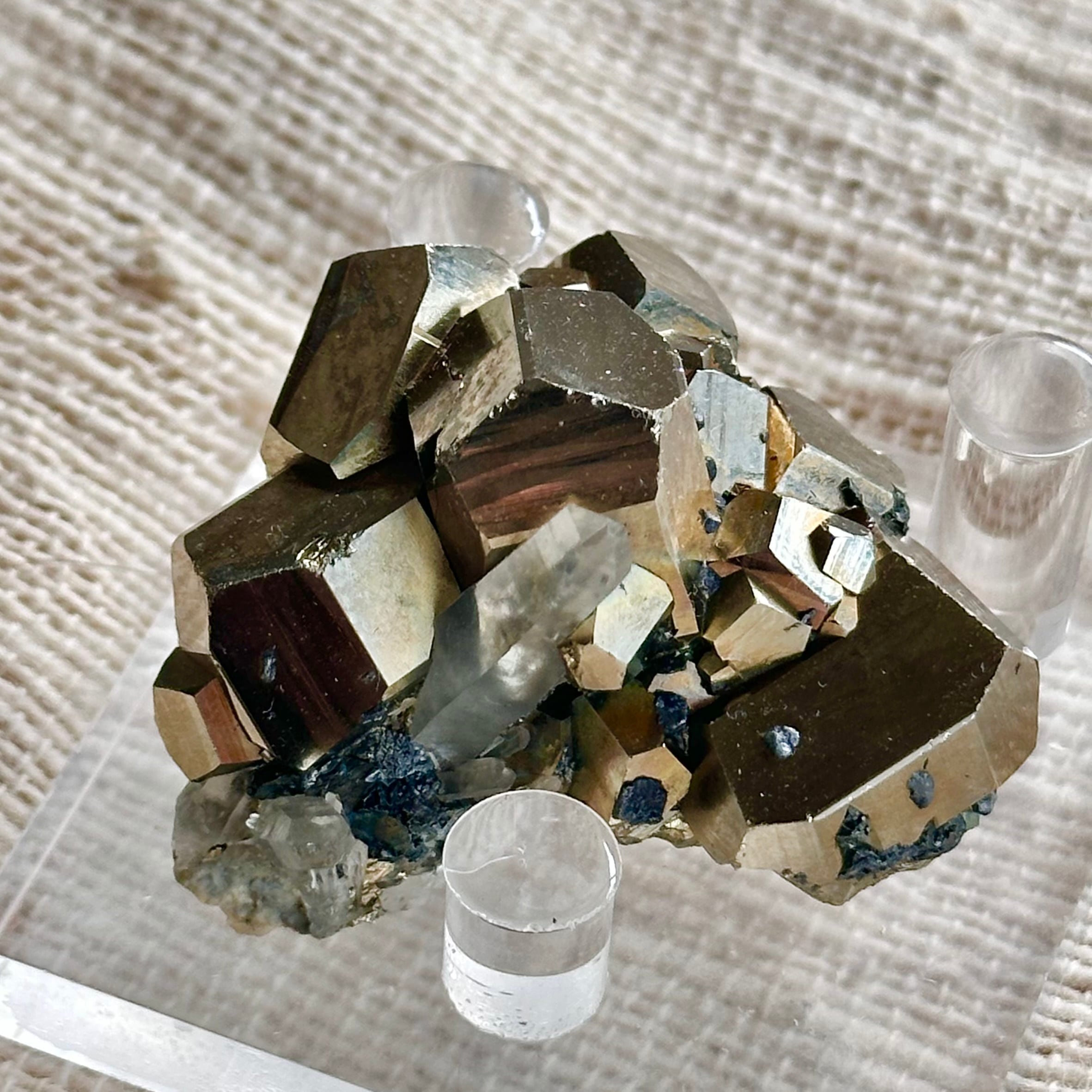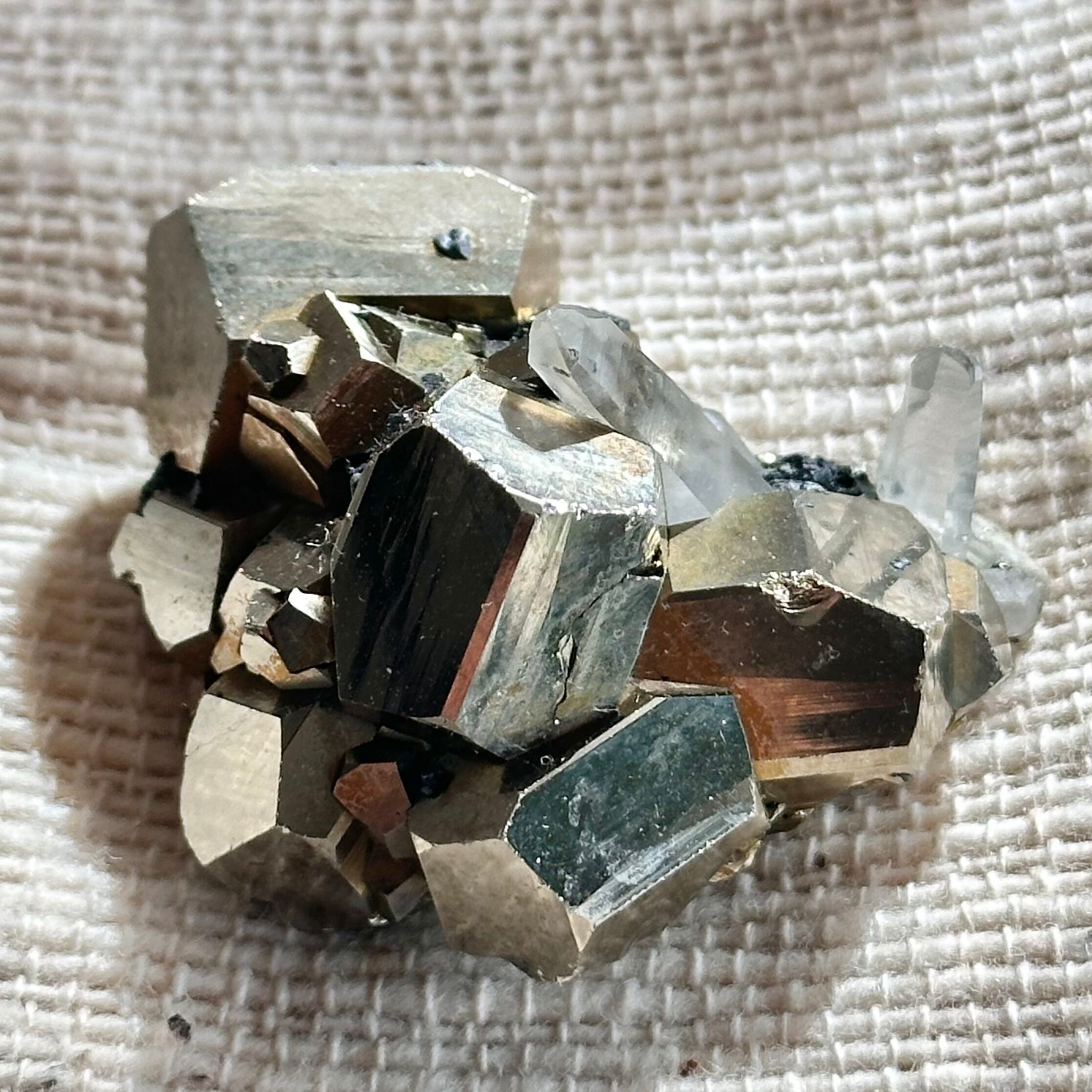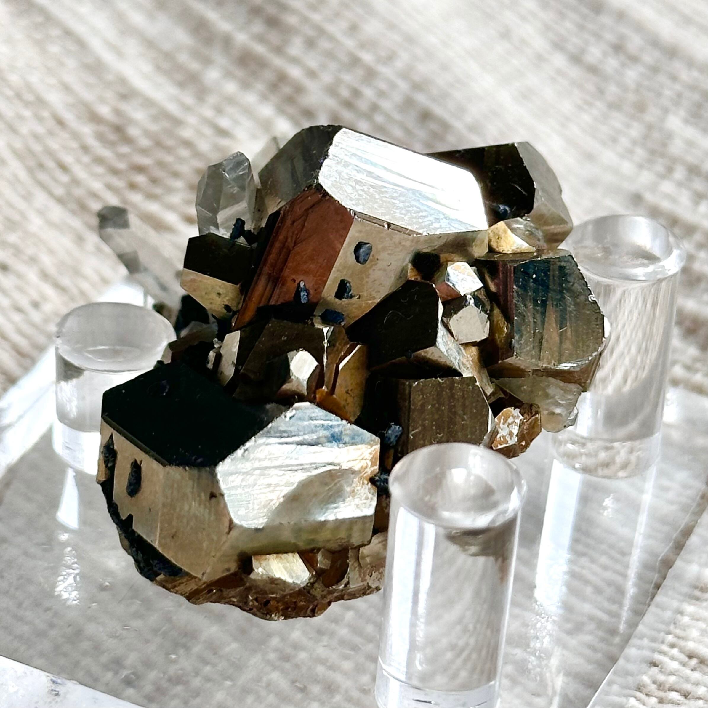 力強さを感じさせるパイライトの結晶と、澄んだ石英ポイントの組み合わせは、重さと軽やかさ、地と光のバランスを思わせる佇まい。