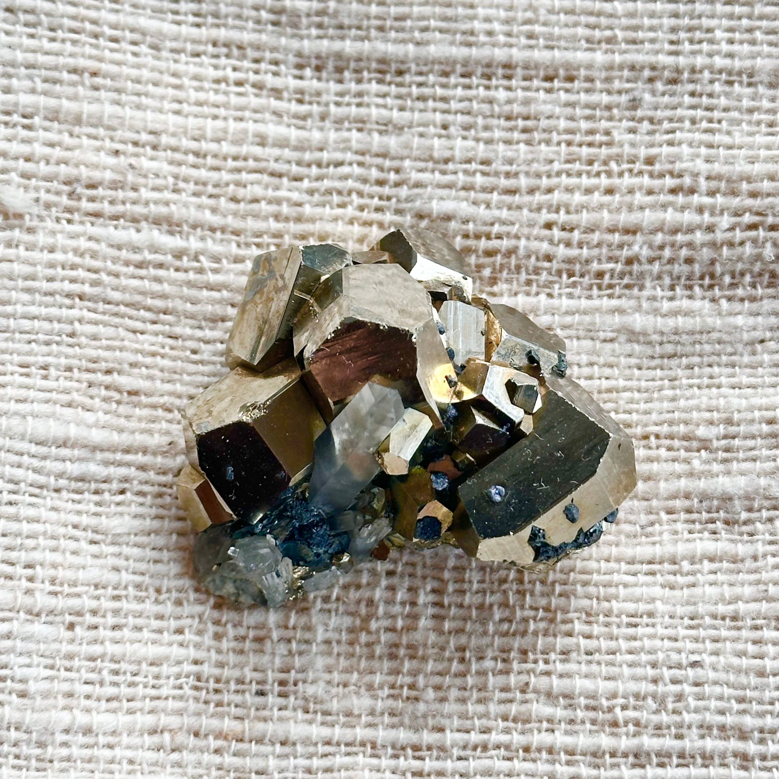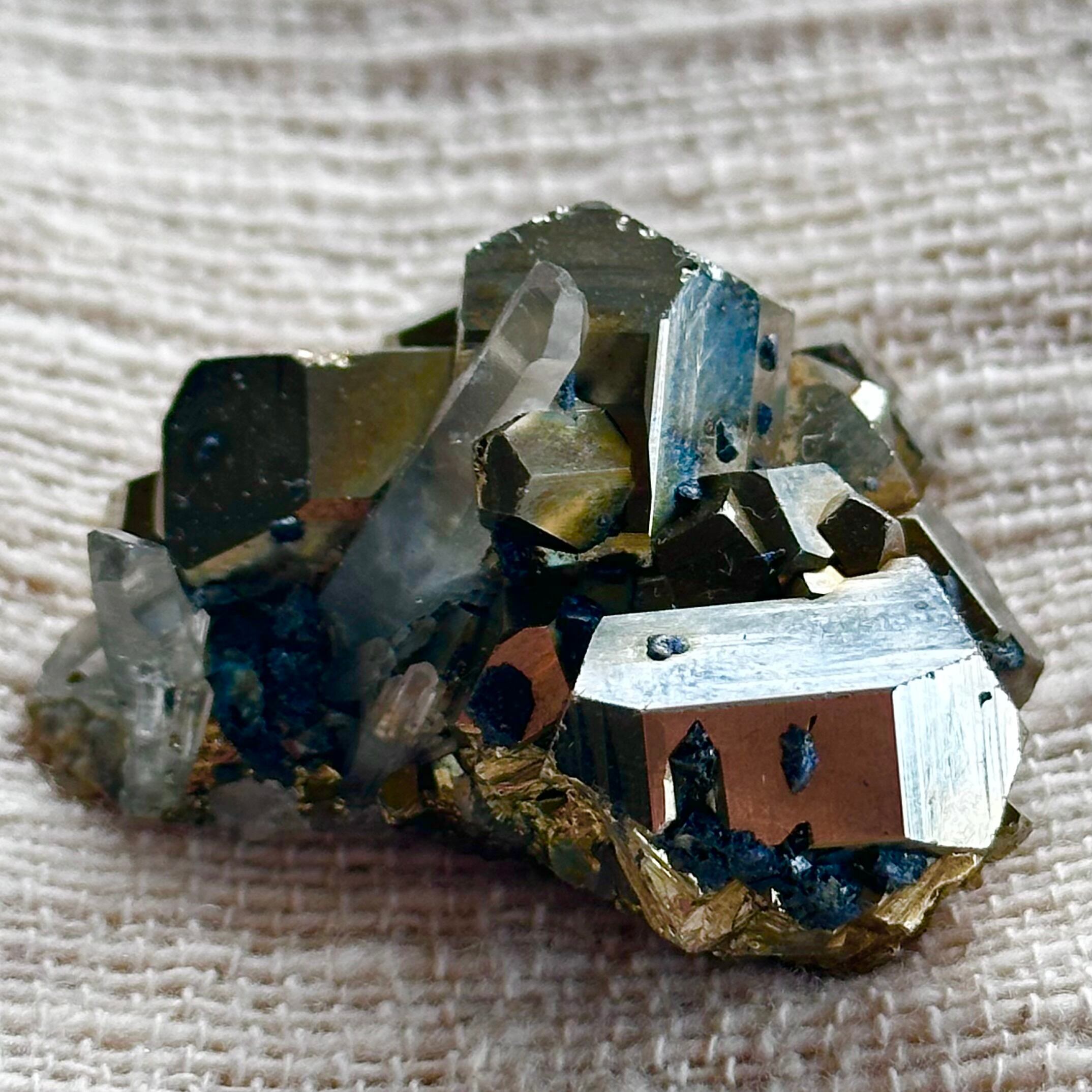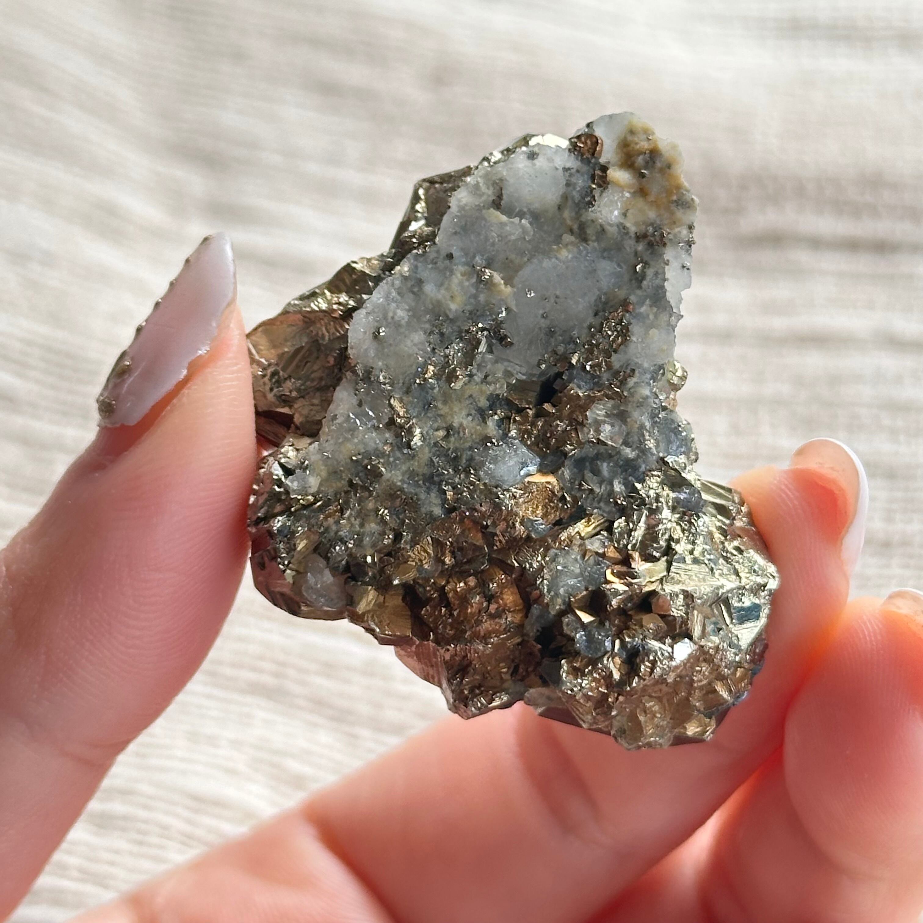 手のひらに収まるサイズ感ながら、結晶一つ一つの存在感が際立ち、光を受けるたびに金属的な輝きと透明感が静かに共鳴します。