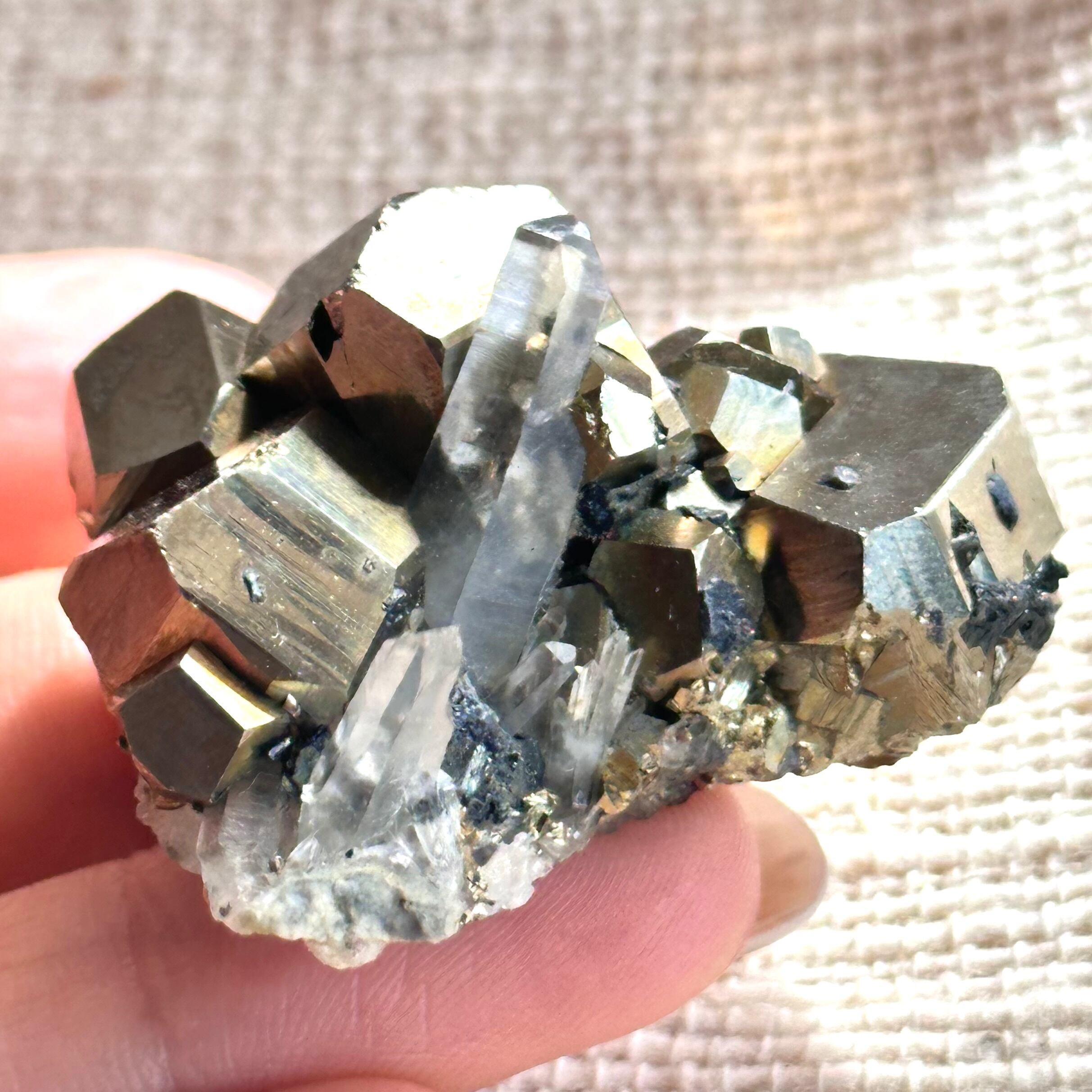 手のひらサイズ【パイライト】大きな結晶|石英ポイント共生 インド産