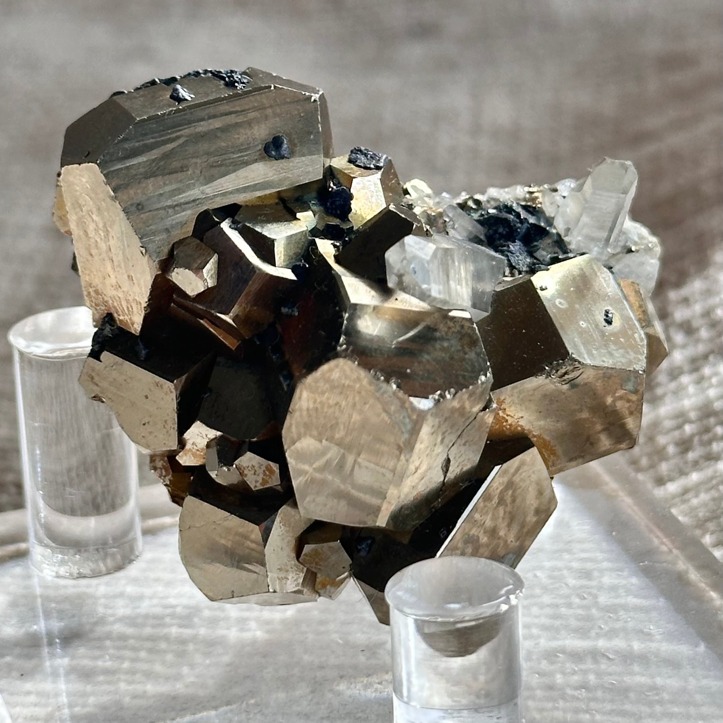 インド産のパイライトに、シャープな石英ポイントが美しく共生した一点もの。