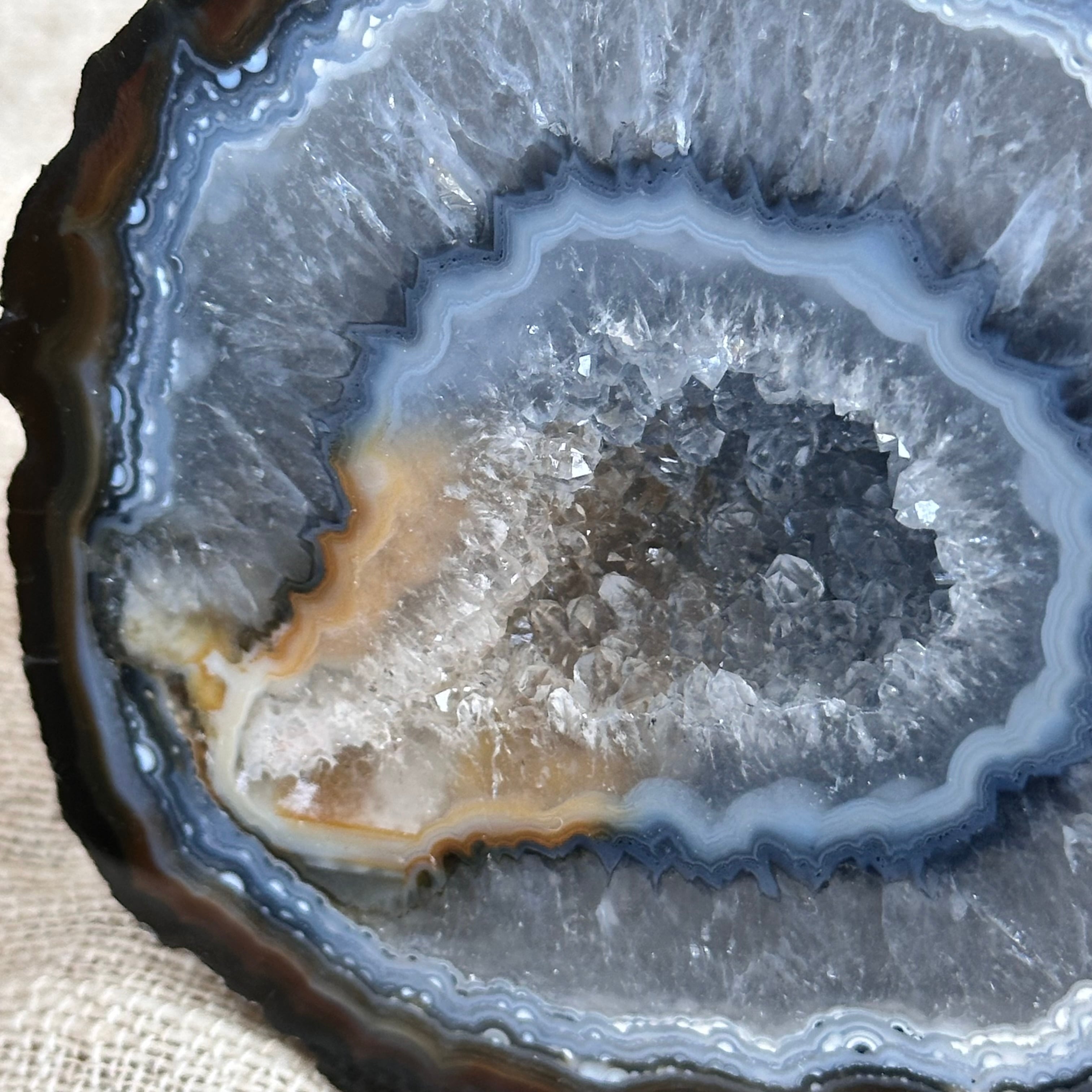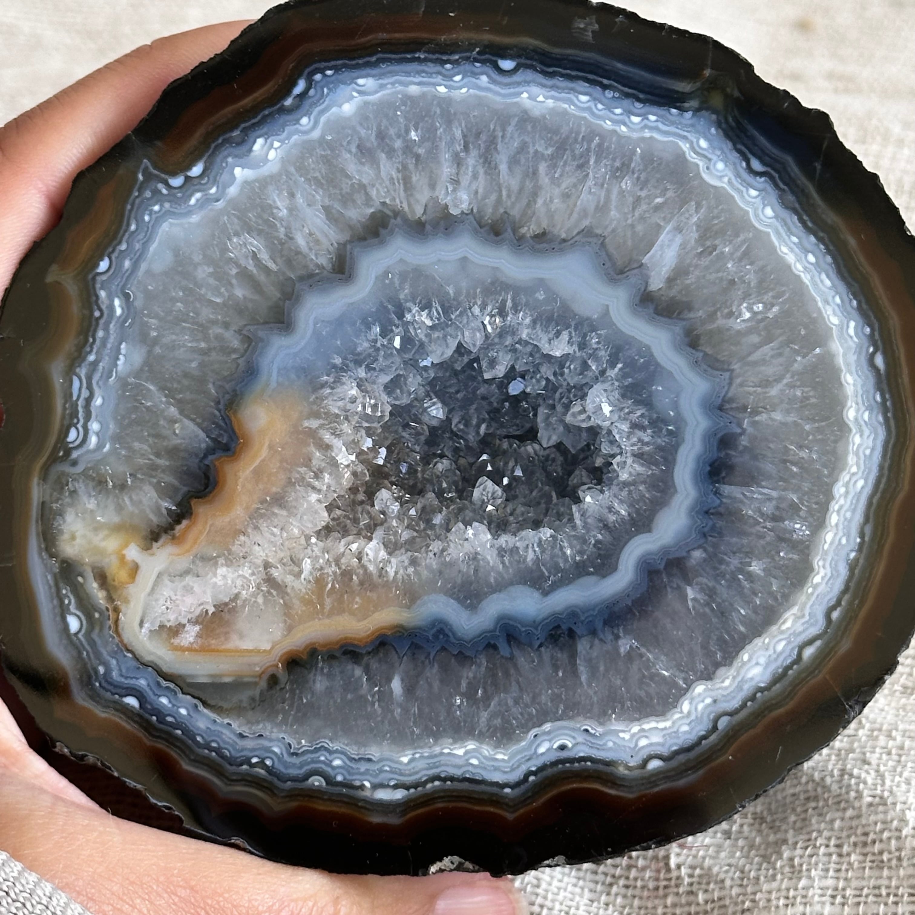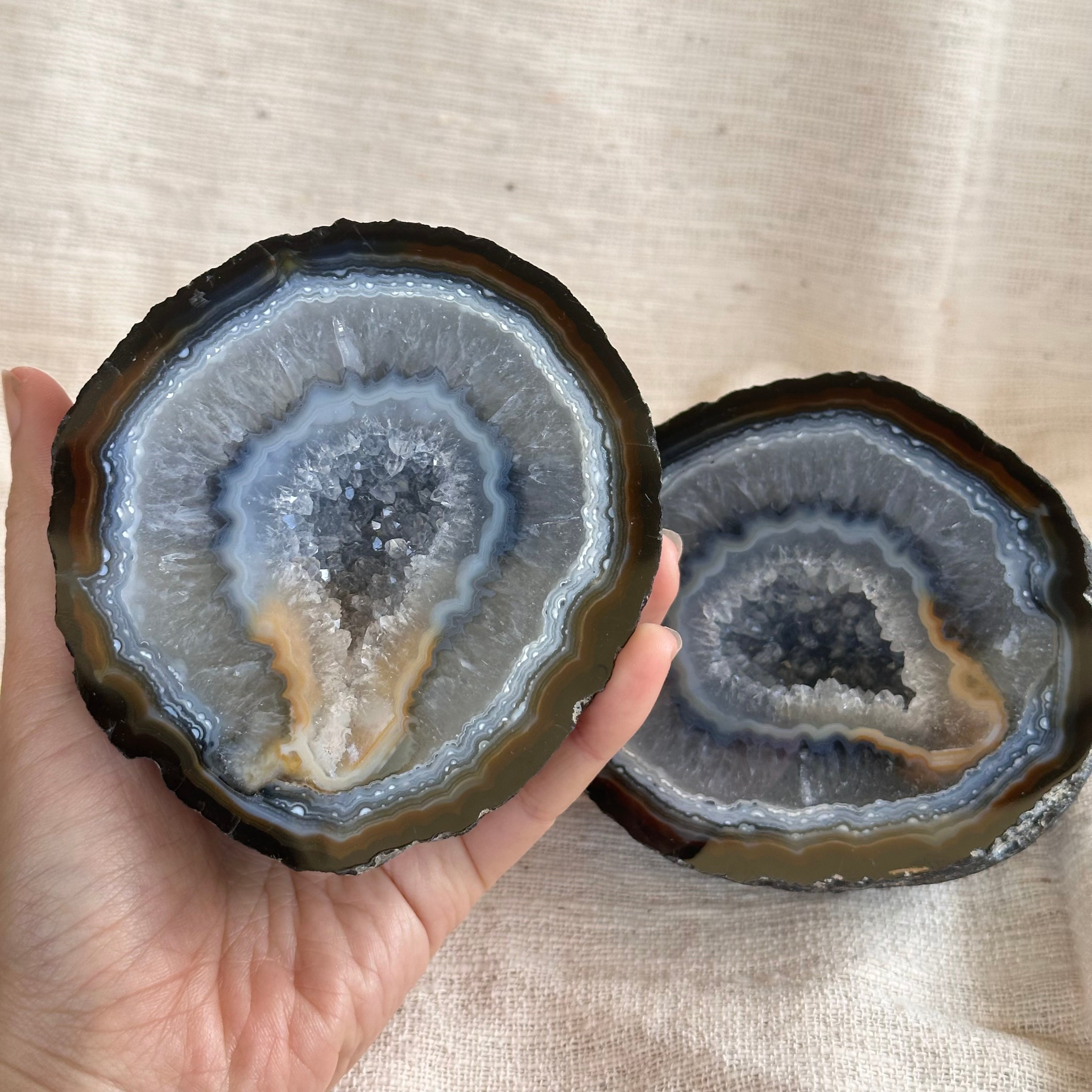 ブラジル産アゲートのジオードを対になるようにカットした、ドゥルジー結晶の美しいペア標本。