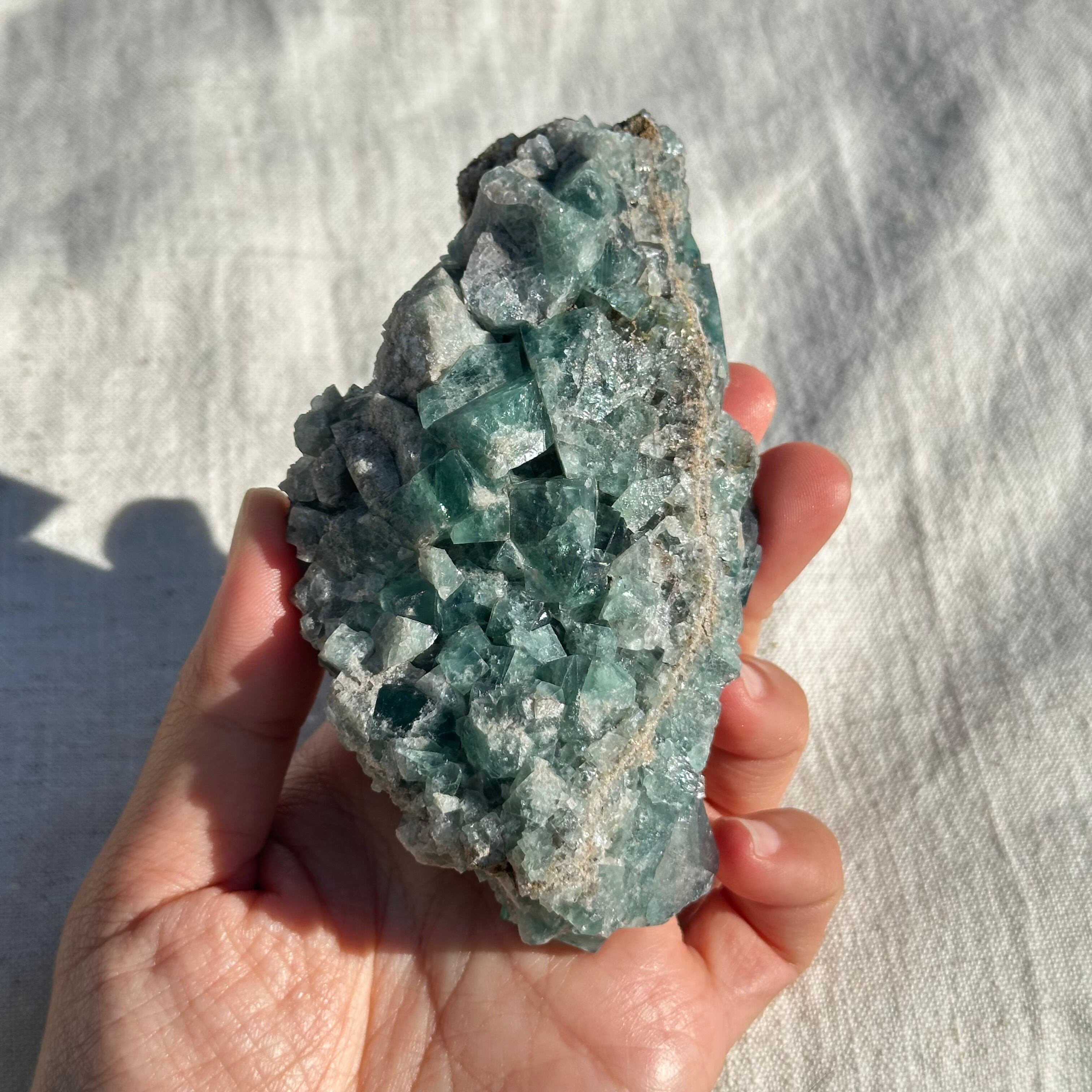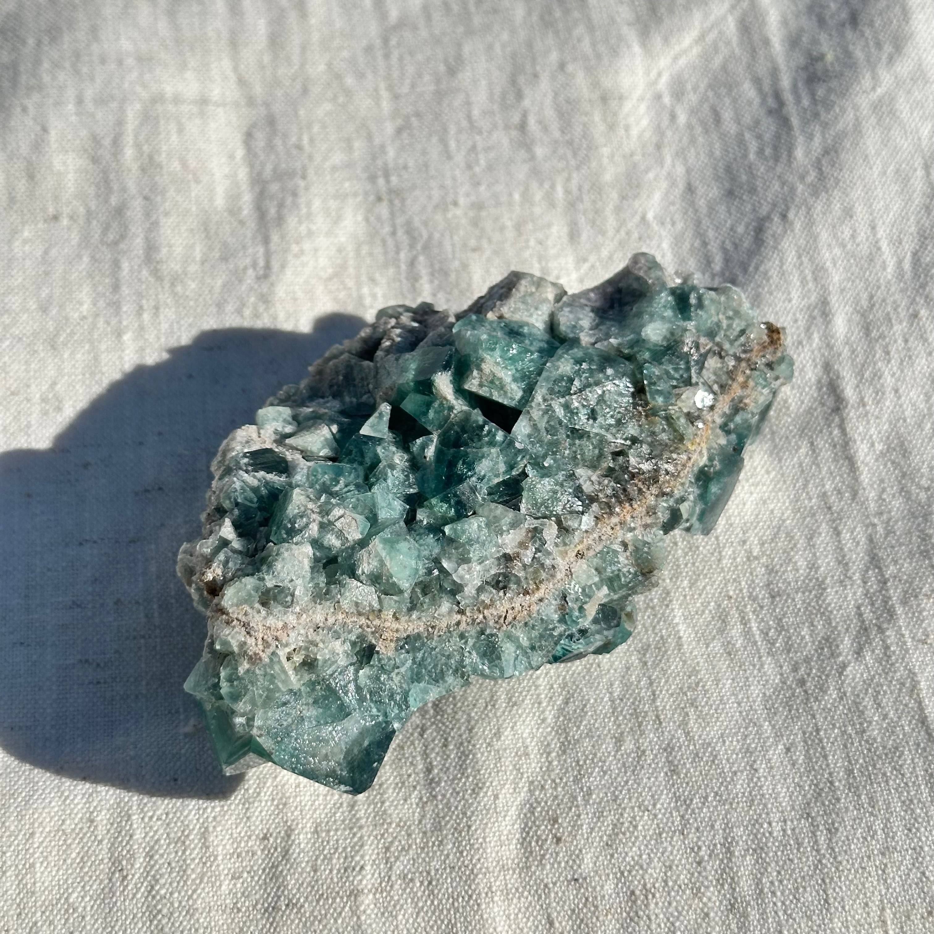 イギリスのロジャリー鉱山で採れた希少価値の高いグリーンフローライトです。緑の発色が鮮やかで、とても美しい一品です。ブラックライト(紫外線)を当てると、太陽の下で見るとブルーを見せてくれます。