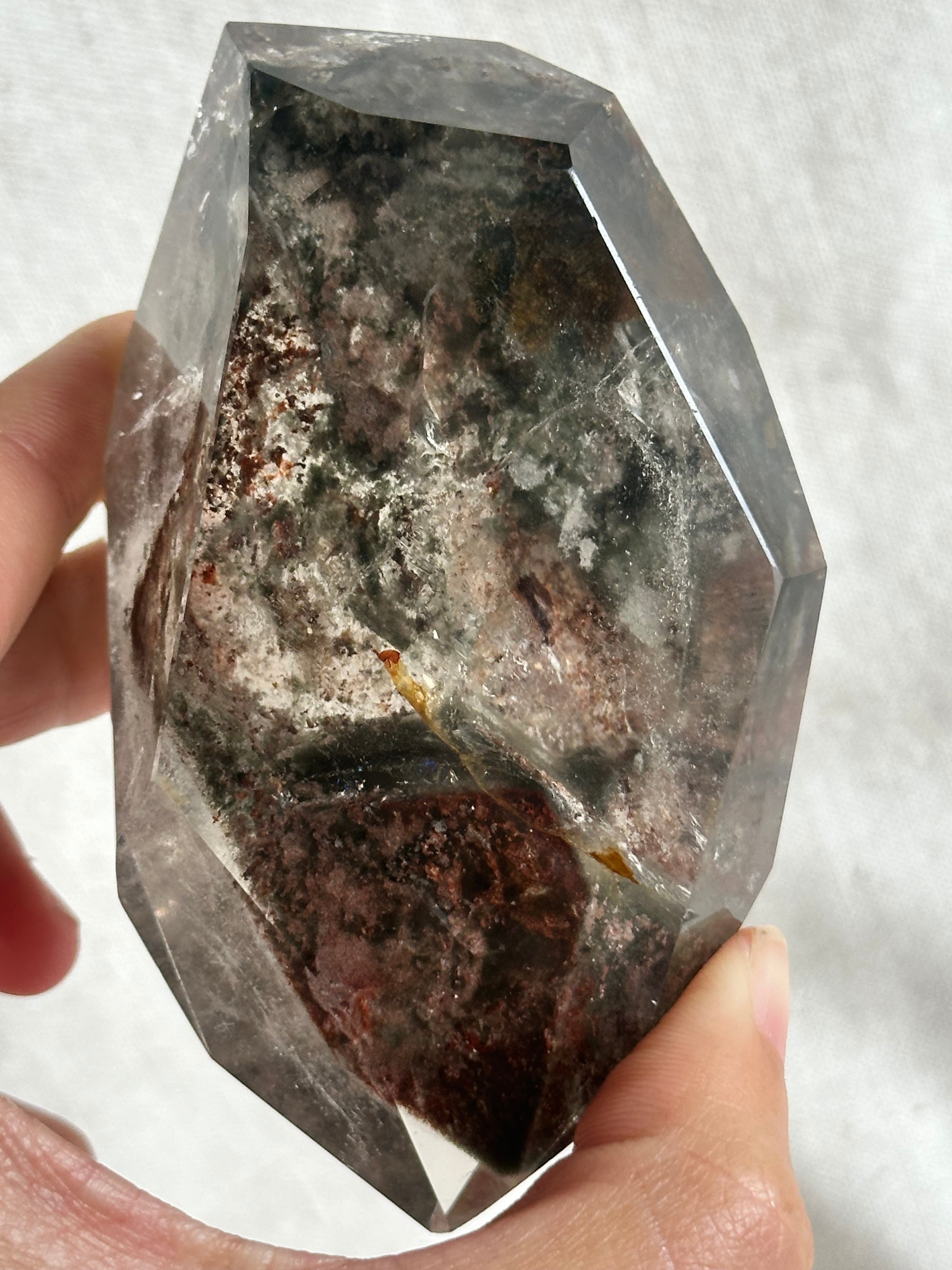 透明度が高い水晶の中には、赤褐色とグリーンの内包物、そして水の泡のようなサシ(天然の気泡)にクラックや虹と、見所満載の一品となっております。
