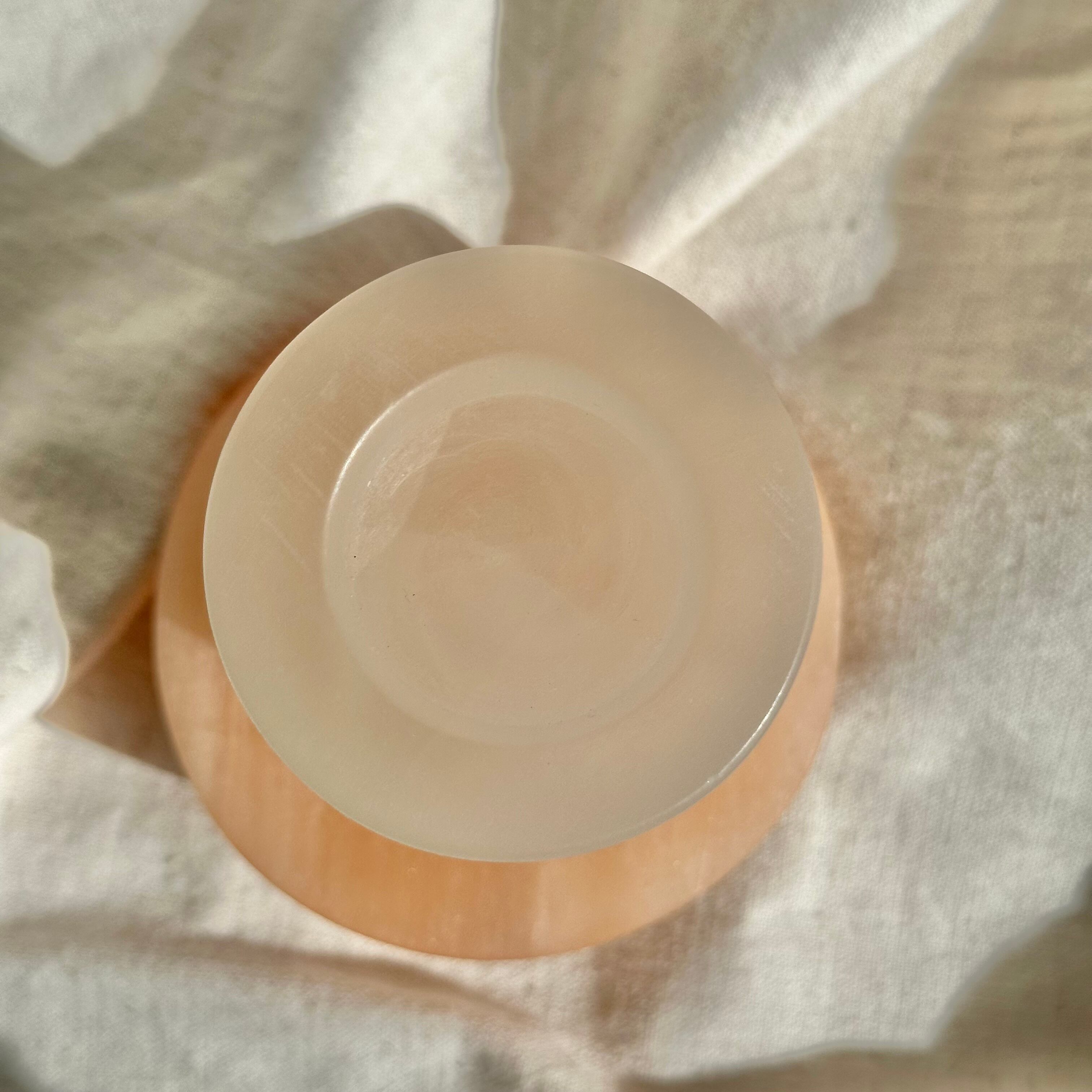 乳白色の柔らかな輝きを放つセレナイトをマッシュルーム型に仕上げたライト。